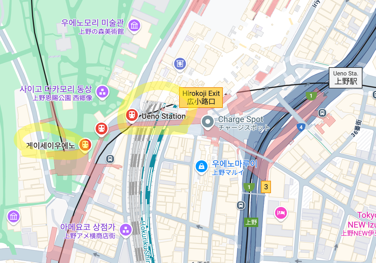 우에노역에서는 JR 야마노테선과 도쿄 메트로 노선을 탈 수 있어서 시부야, 신주쿠, 긴자 등 어디든 금방 이동할 수 있어요. 특히 저는 박물관과 우에노 공원을 들를 계획이 있었기 때문에 우에노역 하차가 정말 딱이었어요. 스카이라이너를 타고 게이세이 우에노역에 내린 후, 도쿄 메트로 패스는 따로 교환해야 됩니다.