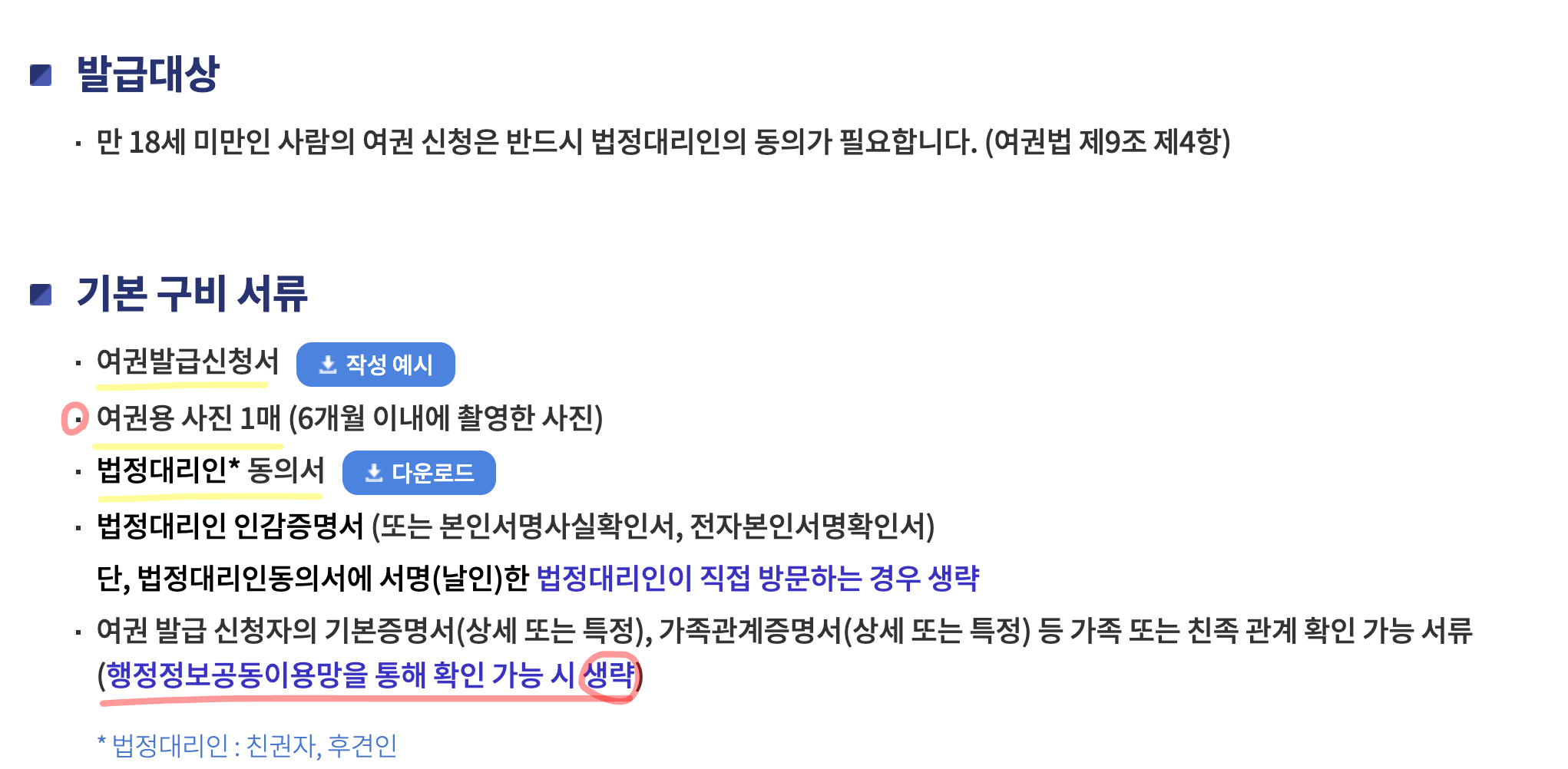 ※ 여권발급신청서와 법정대리인 동의서는 현장에서 직접 작성하면 됩니다. 정말 간단하죠. 인터넷에 찾아보면, 이것저것 준비할 것이 많다고 나오는데요, 부모가 직접 갈 경우, 기관에서 행정정보공동이용망을 이용해서 가족관계를 바로 확인하기 때문에 기존에 필요했던 서류들 이젠 필요없어요.